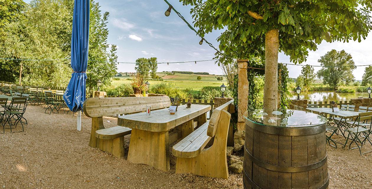 Genießen Sie unter freiem Himmel oder schattenspendenden Kastanien ein frisch gezapftes Bier oder die „hesselberger“ Saftspezialitäten von den Streuobstwiesen aus der Region. Dazu unsere fränkische Schmankerlküche mit hausgemachten Spezialitäten und reichhaltigen Brotzeiten aus eigener Herstellung.