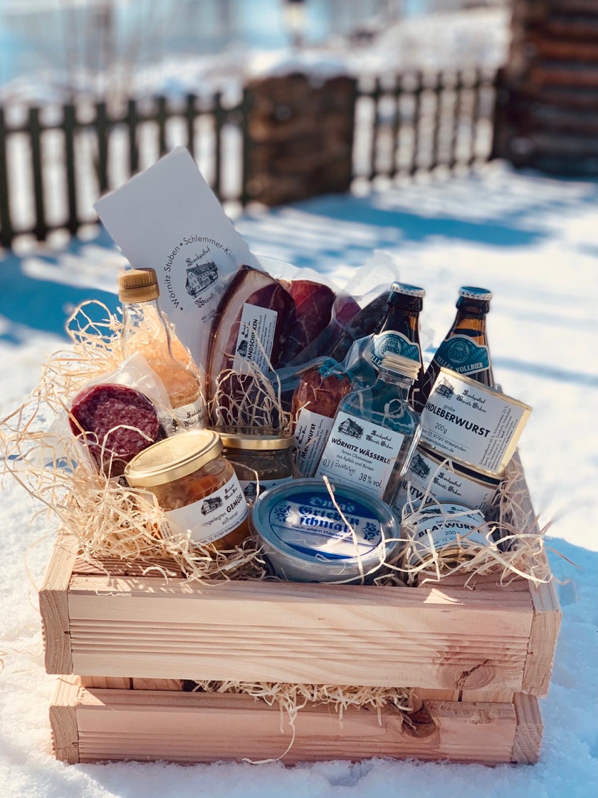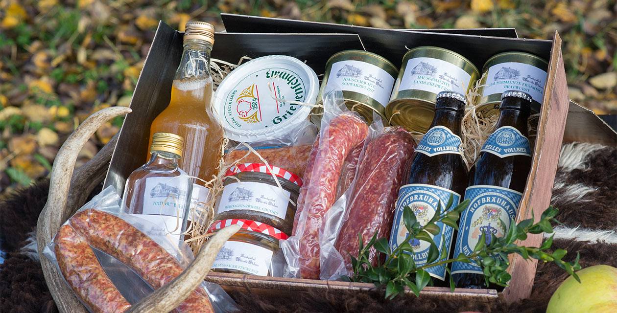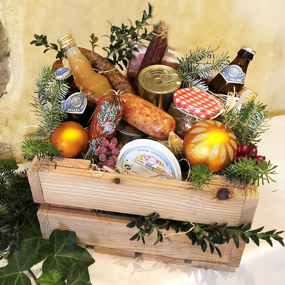 Das perfekte Geschenk für alle Feinschmecker, für tolle Mitarbeiter oder Kollegen, für besondere Freunde oder aber den oder die Liebste/n. Unsere Schlemmer-Kiste macht große Freude und der Inhalt schmeckt einfach sensationell. Ist aber auch nur das Beste drin. Bis auf das süffige Bier vom Hofbräu München kommen alle Produkte aus unserer Heimat, aus eigener Produktion und mit Fleisch von Tieren aus der Region.